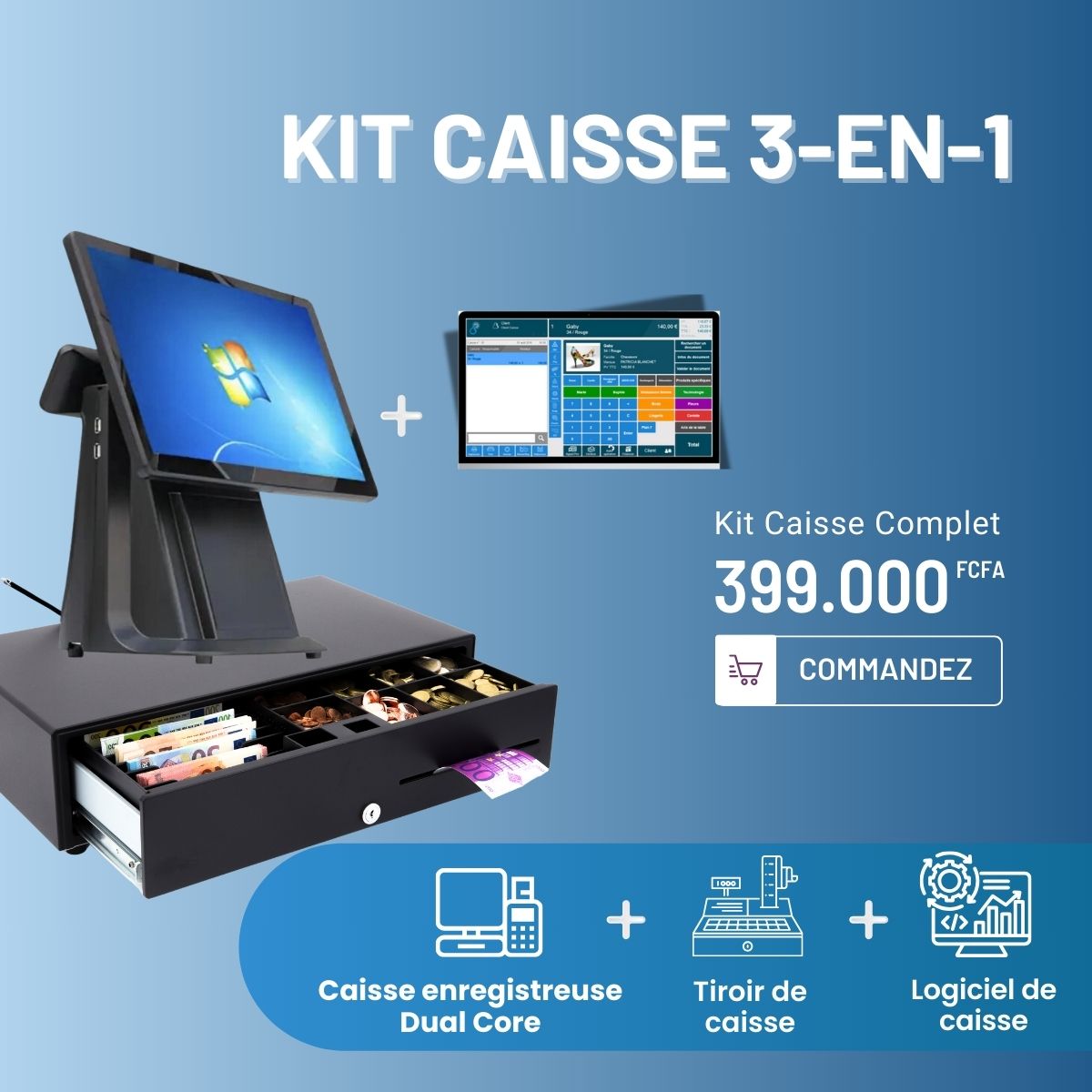 Découvrez le kit caisse enregistreuse 3-en-1 à seulement 399.000 FCFA, offrant une solution complète pour votre commerce. Ce kit comprend une caisse enregistreuse Dual Core, un tiroir de caisse spacieux et un logiciel de caisse intuitif pour une gestion efficace de vos transactions. Idéal pour les commerçants souhaitant optimiser leur point de vente avec technologie et efficacité.