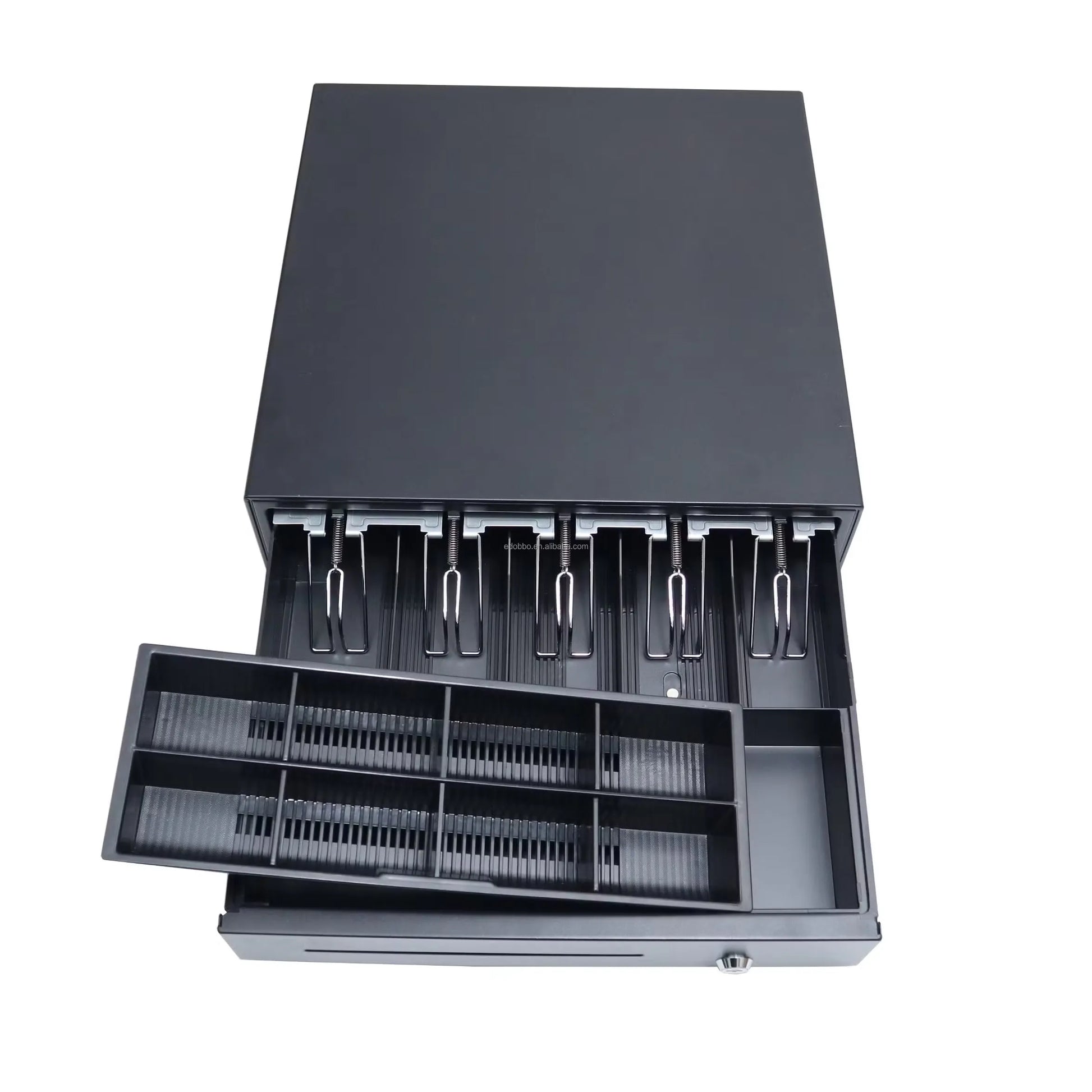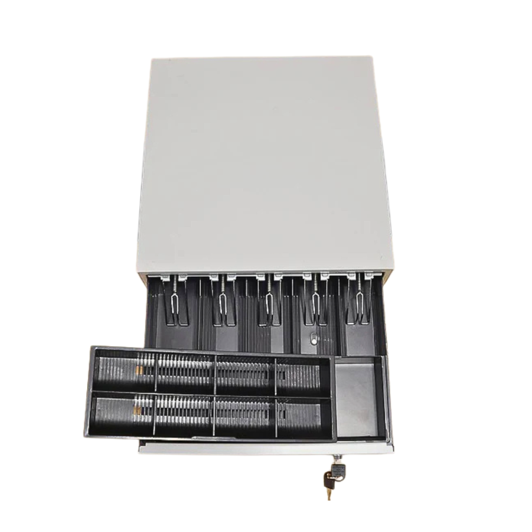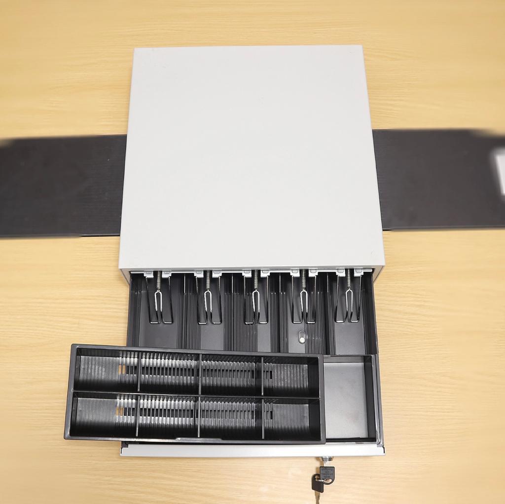 Tiroir de caisse métallique standard équipé d'une ouverture à glissière. Volumineux et résistant, parfait pour ranger l'argent et les pièces en caisse