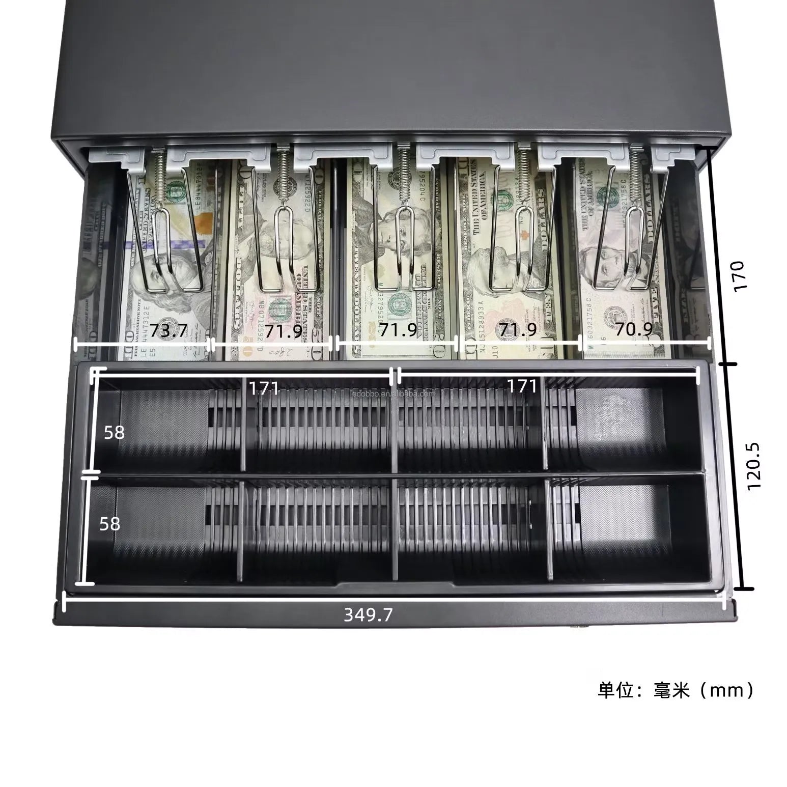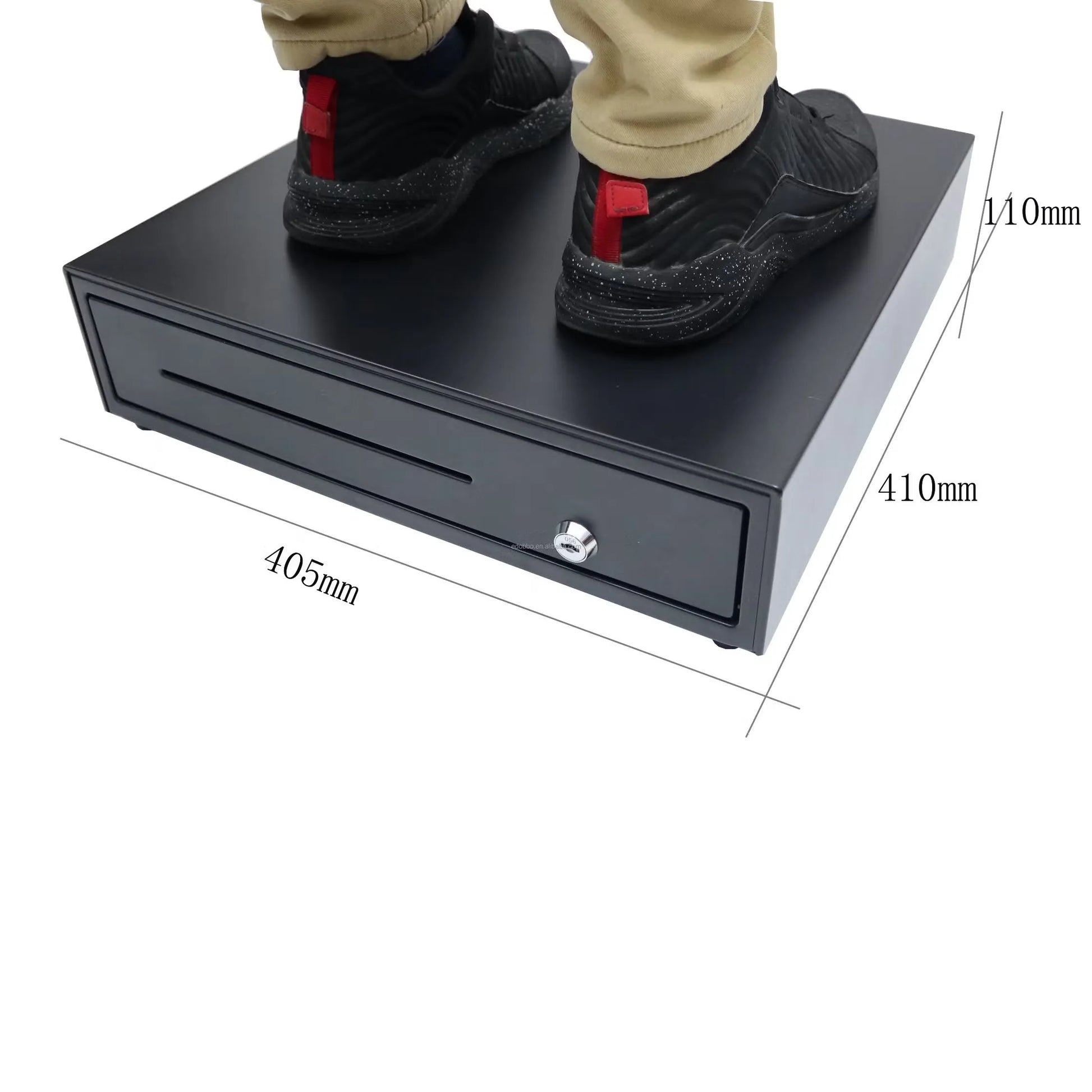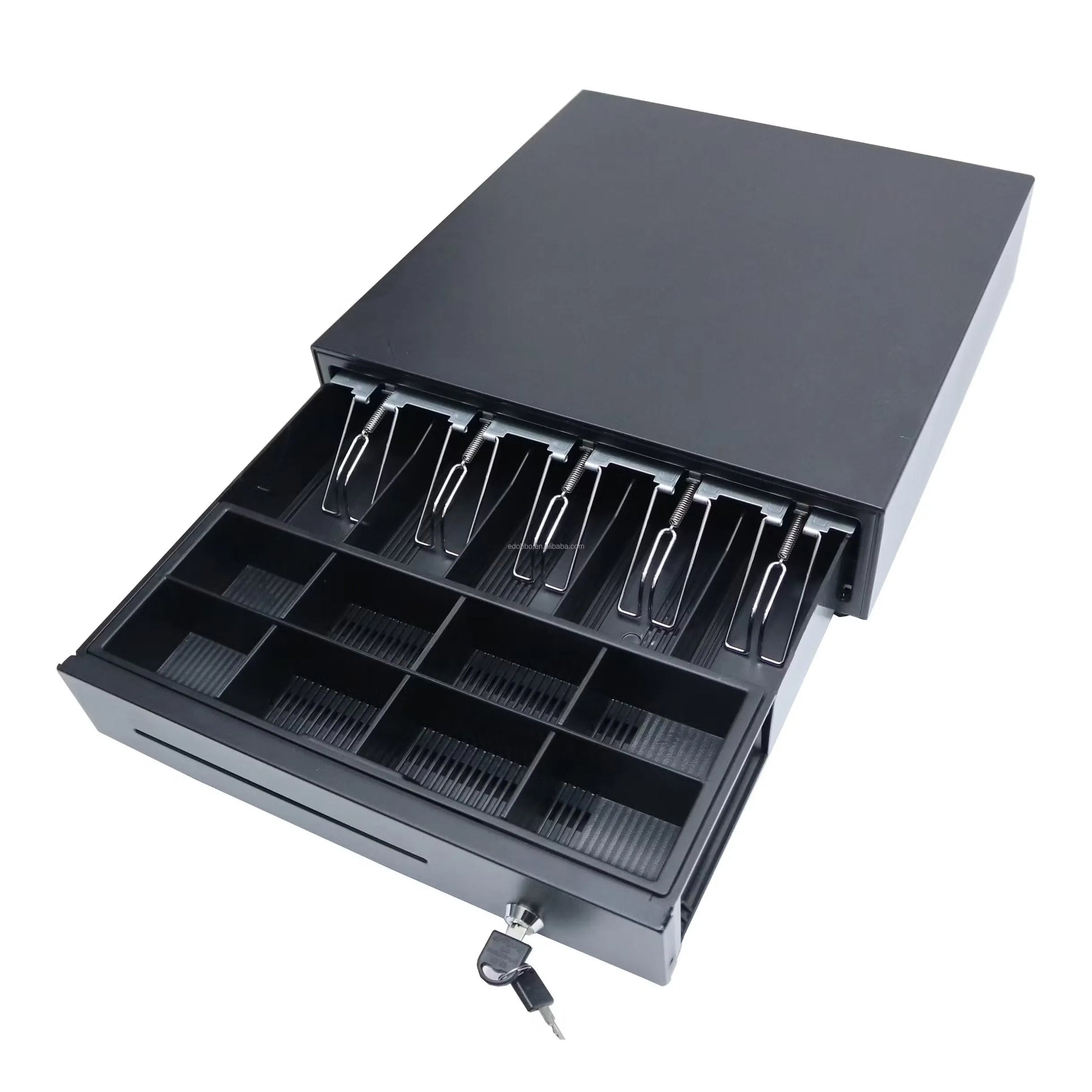 Tiroir de caisse métallique standard équipé d'une ouverture à glissière. Volumineux et résistant, parfait pour ranger l'argent et les pièces en caisse